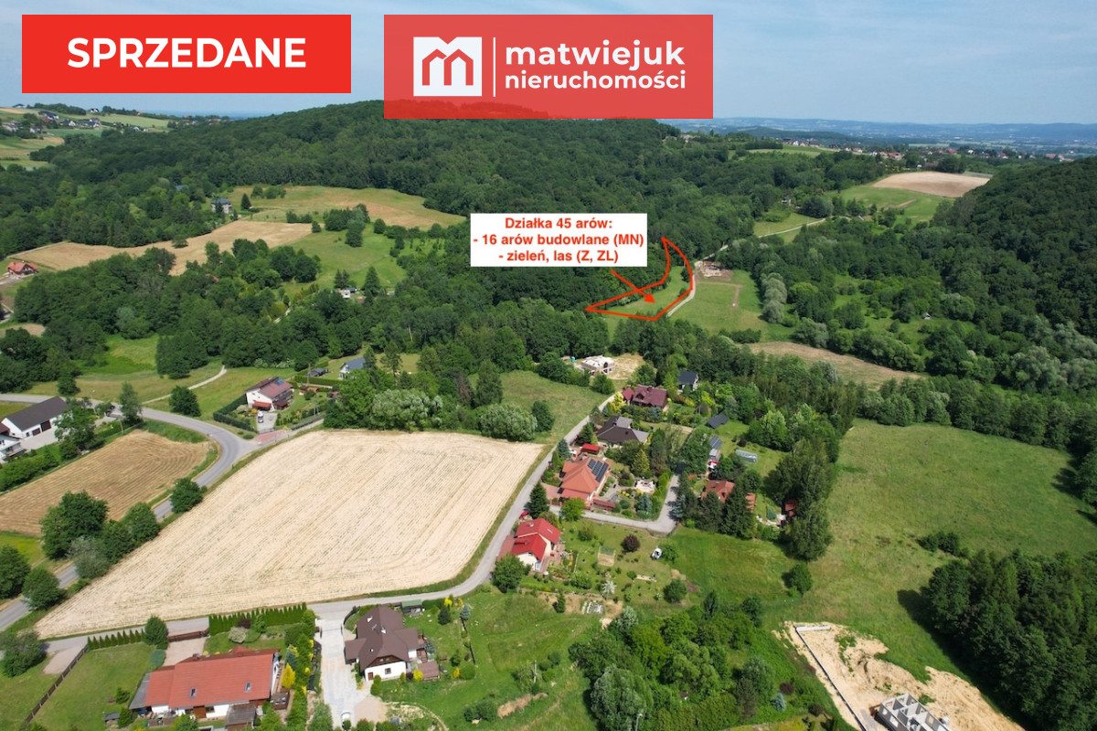 16 arów są budowlane, pozostała część to tereny zielony i las.